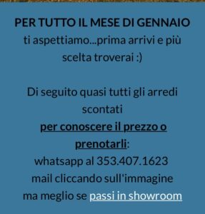 Intanto ti lascio un’anteprima dell’arredo in saldo, ma non è finita qui, passa in show-room oppure se preferisci prenota l’arredo che hai visto inviando una mail di contatto o un wapp al numero 353.407.1623, ti risponderemo in un lampo!